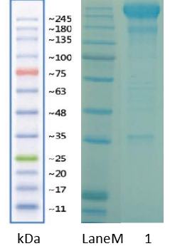 Illustration: Lane M is protein MW marker, Lane 1 is 10ug CoV-2 Spike -Fc protein